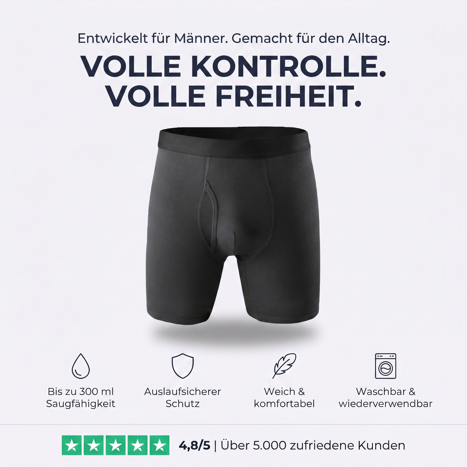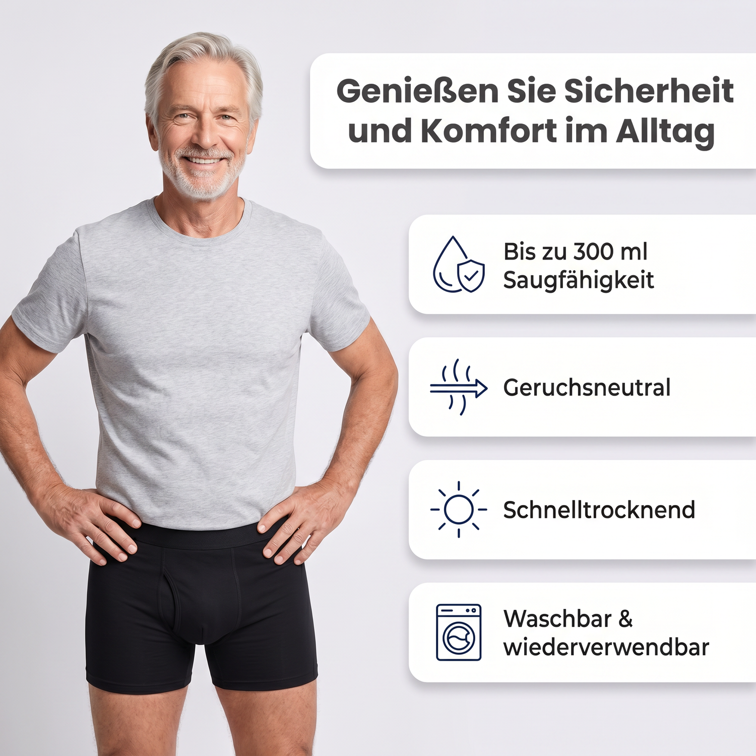 Unsere Inkontinenz-Boxershorts sind für den Alltag entwickelt – Tag und Nacht.